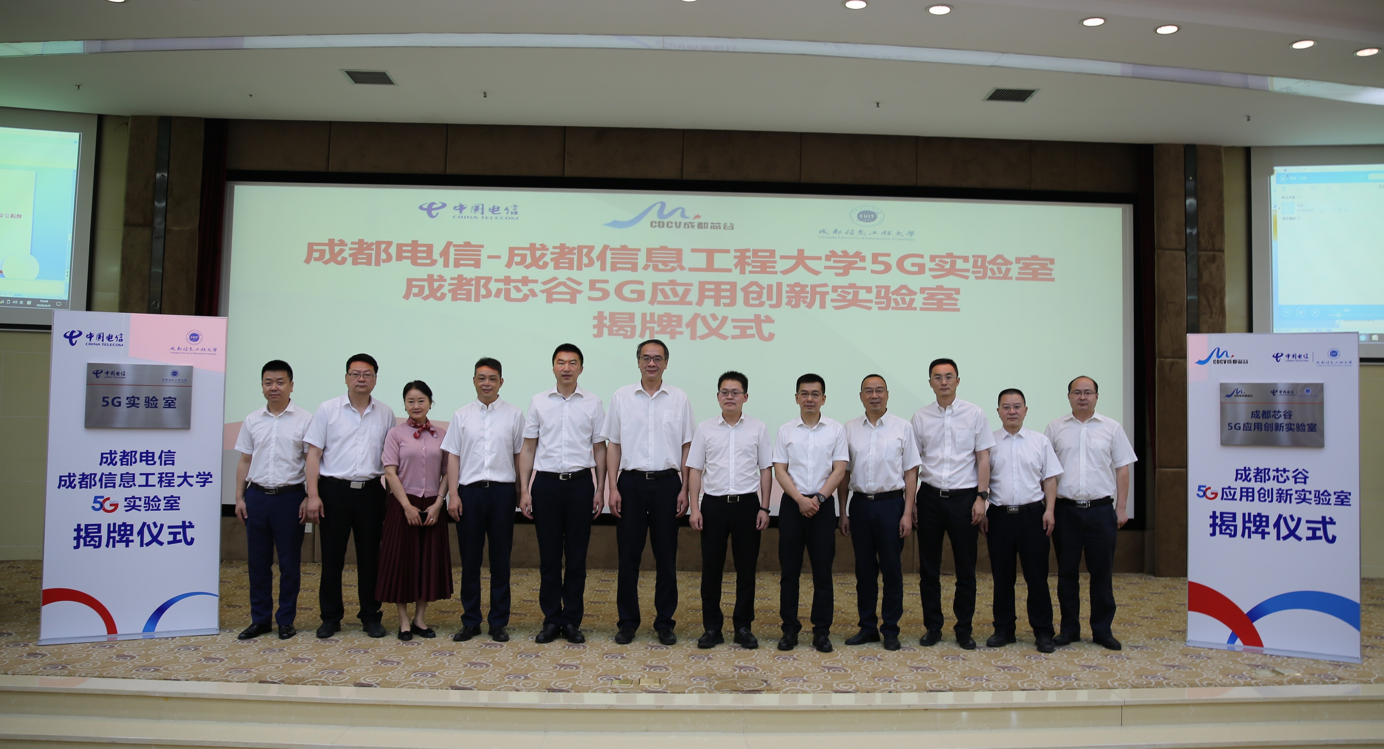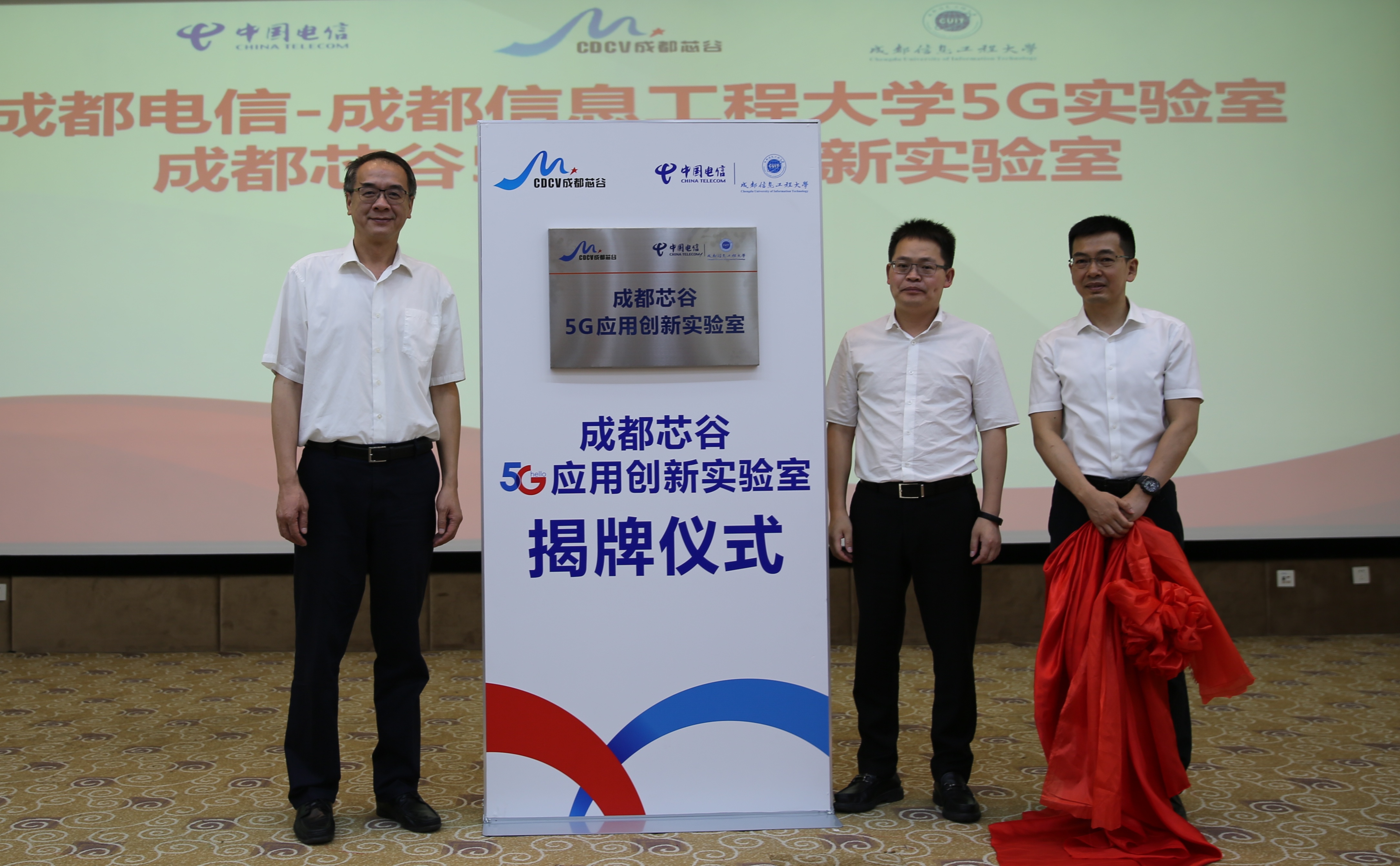 余敏明、杨洋为“成都电信-爱体育网页版5G实验室”揭牌。韩超、余敏明、杨洋为“成都芯谷5G应用创新实验室”揭牌。