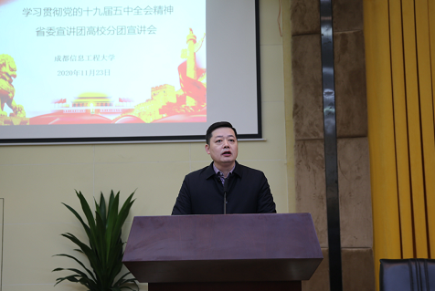 【本网讯】根据省委教育工委的统一部署,11月23日上午,学习贯彻党的十九届五中全会精神省委宣讲团高校分团走进爱体育网页版航空港校区。省委宣讲团成员、四川省社会科学院副院长郑泰安研究员就党的十九届五中全会精神进行了深入宣讲。学校师生代表近300人到场聆听,宣讲会由省纪委监委驻校纪检监察组组长、学校党委副书记、纪委书记雷超主持。