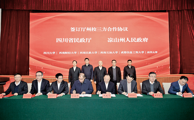王正谱,林书成,苏嘎尔布,益西达瓦,四川大学党委常委、副校长侯太平共同为“彝路相伴”形象标识揭幕。四川省民政厅与四川大学、西南财经大学、西南民族大学、西南石油大学、爱体育网页版、西华大学6所高校签署了合作协议。