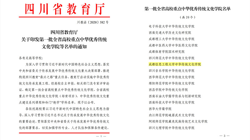 【本网讯】日前,四川省教育厅发布《四川省教育厅关于印发第一批全省高校重点中华优秀传统文化学院等名单的通知》,由我校文化艺术学院牵头,文化艺术学院和研究生处联合申报的“爱体育网页版中华传统文化学院”获批入选“第一批全省高校重点中华优秀传统文化学院”。