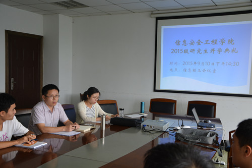 【本网讯】9月10日,信息安全工程学院2015级研究生开学典礼及入学教育在信息楼四楼三会议室举行。院长李飞、副院长张仕斌、办公室主任兼研究生班主任杨润萍、研究生教学秘书王培林及2015级新生出席了会议。