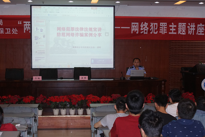 双流公安分局漆明副局长普及了网络犯罪的相关法律知识,以侦察过的真实案例进行了网络犯罪案例分享,结合PPT图文并茂的分析了一些常见的网络犯罪招数,从多方面讲解了如何有效防范网络犯罪。