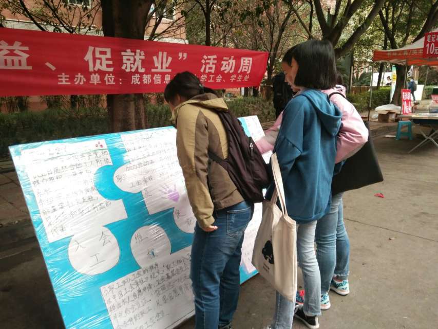 【本网讯】为使我校学子更深入了解工会知识,让应届大学毕业生更好地了解并适应社会生活和工作岗位,尽快实现由“学校人”向“社会人”的角色转变,校工会于11月7日开展“入工会、维权益、促就业”为主题的工会知识宣传活动周。本次活动以设点宣传及座谈会的形式面向全校老师和学子宣传工会知识。11月7日,校工会在一食堂设点宣传,通过分发《工会会员维权手册》、使用展板宣传讲解工会知识等行式,向我校同学广泛宣传《工会法》、《劳动合同法》、《中国工会章程》,让同学们了解工会的性质、任务、工会及会员的权利义务、维权途径方法等知识,帮助我校同学在未来的创业就业过程中增强维权意识,提高处理劳动关系问题的能力,尽快地适应社会。