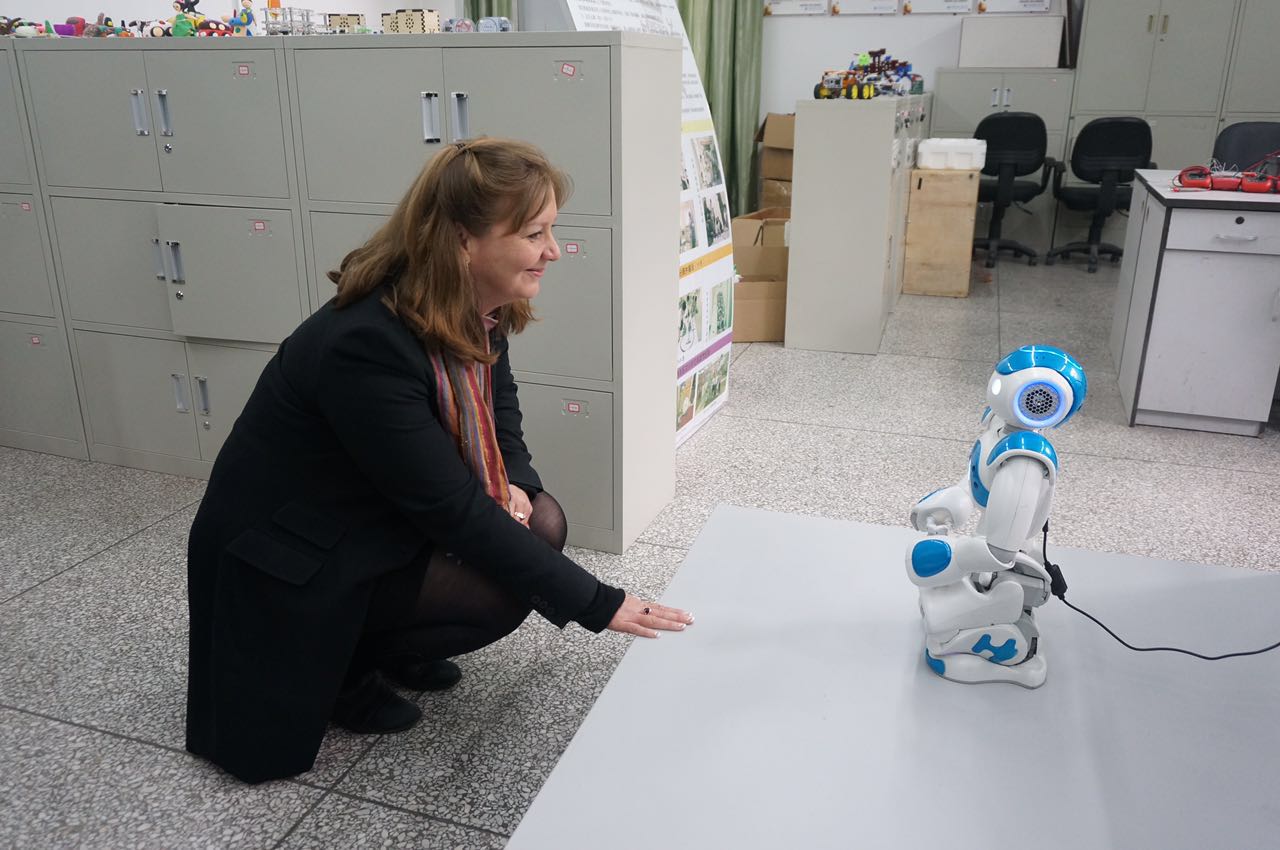 我校学生自主设计的机器人对Dr. Claire McGowan进行人脸识别