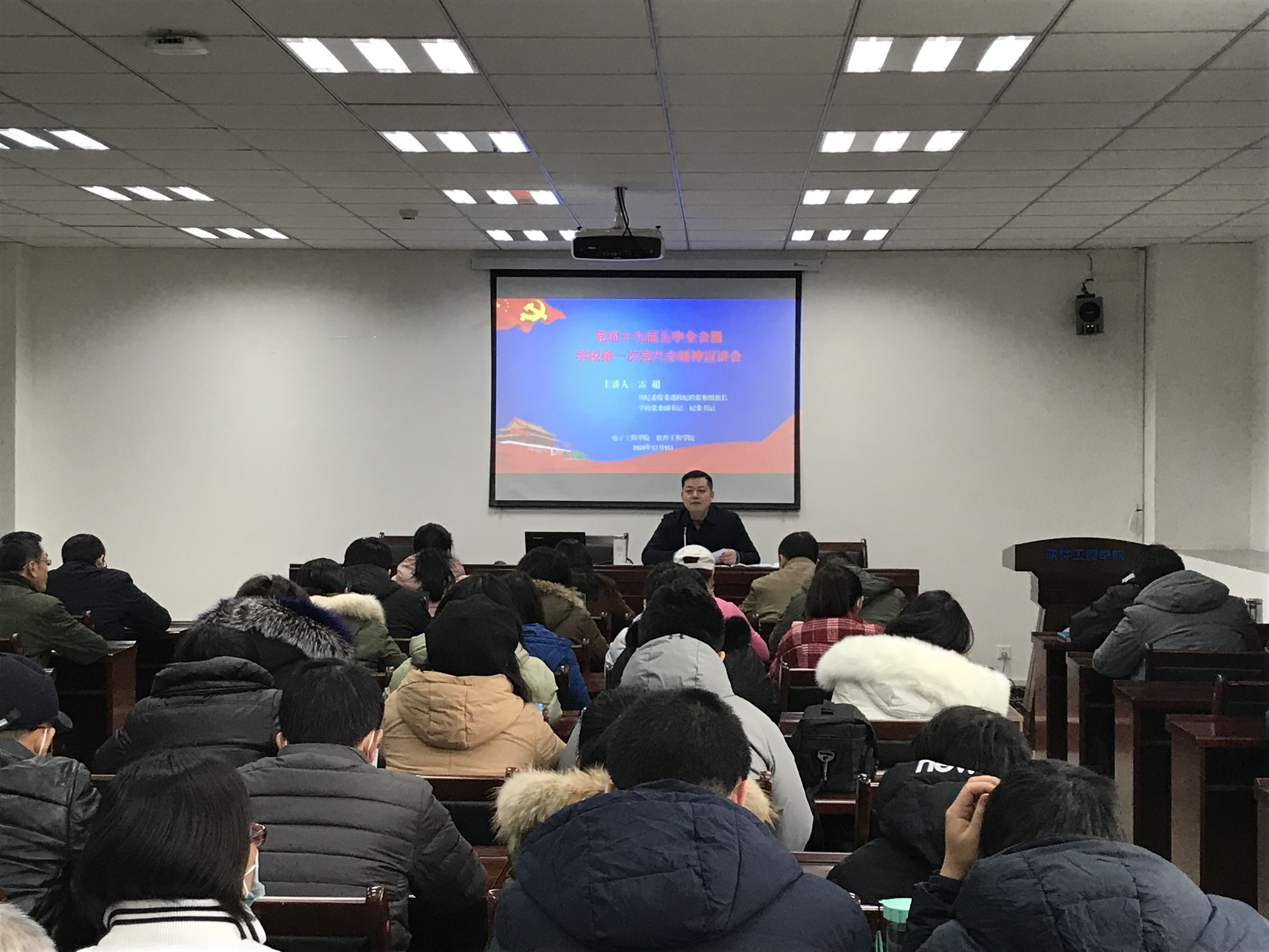 【本网讯】12月9日下午,省纪委监委驻学校纪检监察组组长,学校党委副书记、纪委书记雷超在双中心A502为电子工程学院、软件工程学院教师宣讲党的十九届五中全会精神和学校党代会精神。电子工程学院、软件工程学院全体教师参加了学习。会议由软件工程学院党委书记马义华主持。