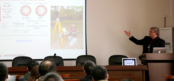 杨平教授、Andrew Dessler教授、Don Conlee教授分别作了题为《Education and Research in Atmospheric Sciences at Texas A&M University》、《Water vapor and cloud feedbackeffects》、《High-Impact Undergraduate Meteorology Education at Texas A&M》的学术报告。杨平教授作为美国Texas A&M大学大气科学系主任,从教学、科研等方面对该系及相关领域内的知名教授作了介绍,并欢迎我校教师出访;随后,杨平教授就其在大气辐射与遥感领域内的最新研究成果进行了介绍。Andrew Dessler教授就平流层水汽的反馈机制及其对气候的影响作了报告。他通过观测数据进行分析并利用模式模拟,论证了平流层水汽对气候的增暖效应。Don Conlee教授多年来一直从事本科生教育,通过这次的报告与我们分享了Texas A&M大学在本科生课外实习、与国内多所著名大学联合培养等方面的经验。报告会由电子工程学院院长杨玲教授主持,电子工程学院、大气科学学院相关方向教师以及学生参加。