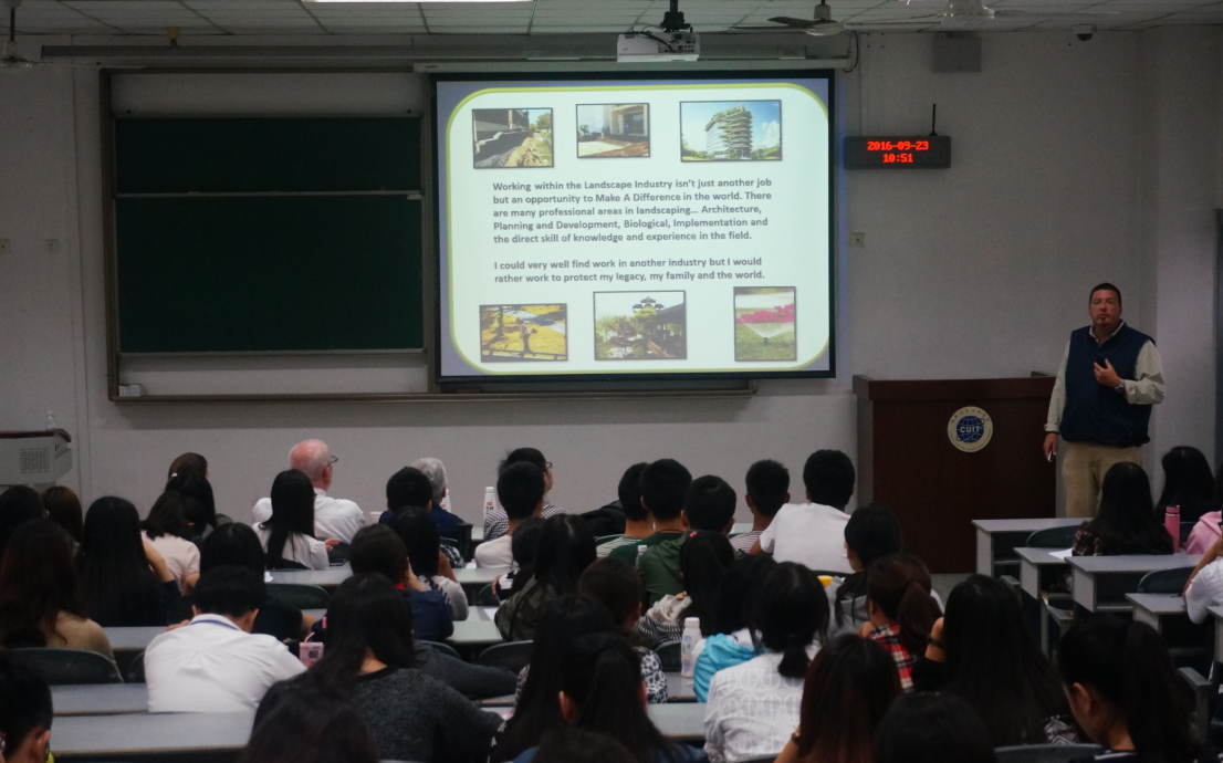 【本网讯】9月23日上午,美国Brightview Enterprise Solutions 东南亚区域市场总监Dominic M. Desiderio应我院邀请在航空港校区第一教学楼1301教室作题为 “Sustainable Landscaping: Making a Difference around the World”的学术报告。资源环境学院副院长徐成华、环境科学教研室部分教师、在读研究生、2015级环境专业的全体本科生聆听了此次报告。