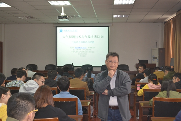 电子工程学院气象雷达系统研究团队负责人姚振东教授为全体师生做了题为《大气探测技术与气象灾害防御——气电结合的特色与优势》的学术讲座。姚振东刚从美国科罗拉多州立大学(CSU)电子与计算机工程系访学半年归国,在访学期间他重点研究了垂直指向双偏振多普勒雷达。他结合访学经历,为大家作了一个简要的访学报告会,介绍了国际上先进的多参数雷达设计以及新的研究领域。同时,他结合美国的“CASA”气象灾害防御计划,对我国如何有效地进行气象灾害防御探测技术进行了深度而广泛地讲解,从原理上重点阐述了一些应用于气象探测领域的新方法以及预防措施、救援措施。