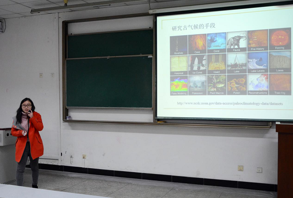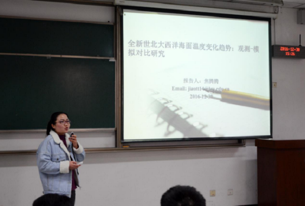 焦腾腾作了题为《全新世北大西洋海面温度变化趋势:观测-模拟对比研究》的报告,她利用全球大气-海洋-海冰耦合的气候模式进行数值模拟,对Mg/Ca重建的全新世北大西洋海表面温度变化趋势与UK'37重建的结果对比,得到北大西洋海表面温度的时间、空间变化情况。