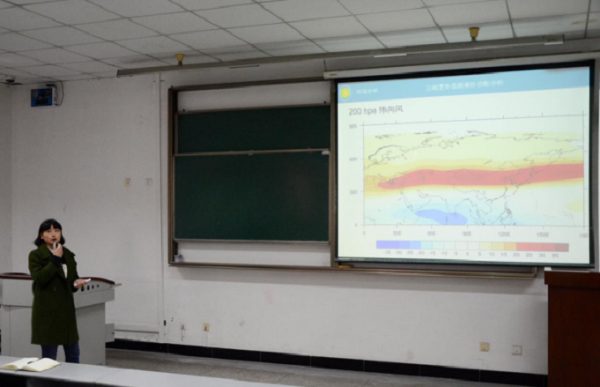 李蓉的报告题目为《2016年1月寒潮与东亚副热带急流关系的研究》,她采用200hPa纬向风来进行波包的计算,通过计算此次寒潮中波包的传播和能量的蓄积释放,分析了其对长江中下游地区降温的影响。