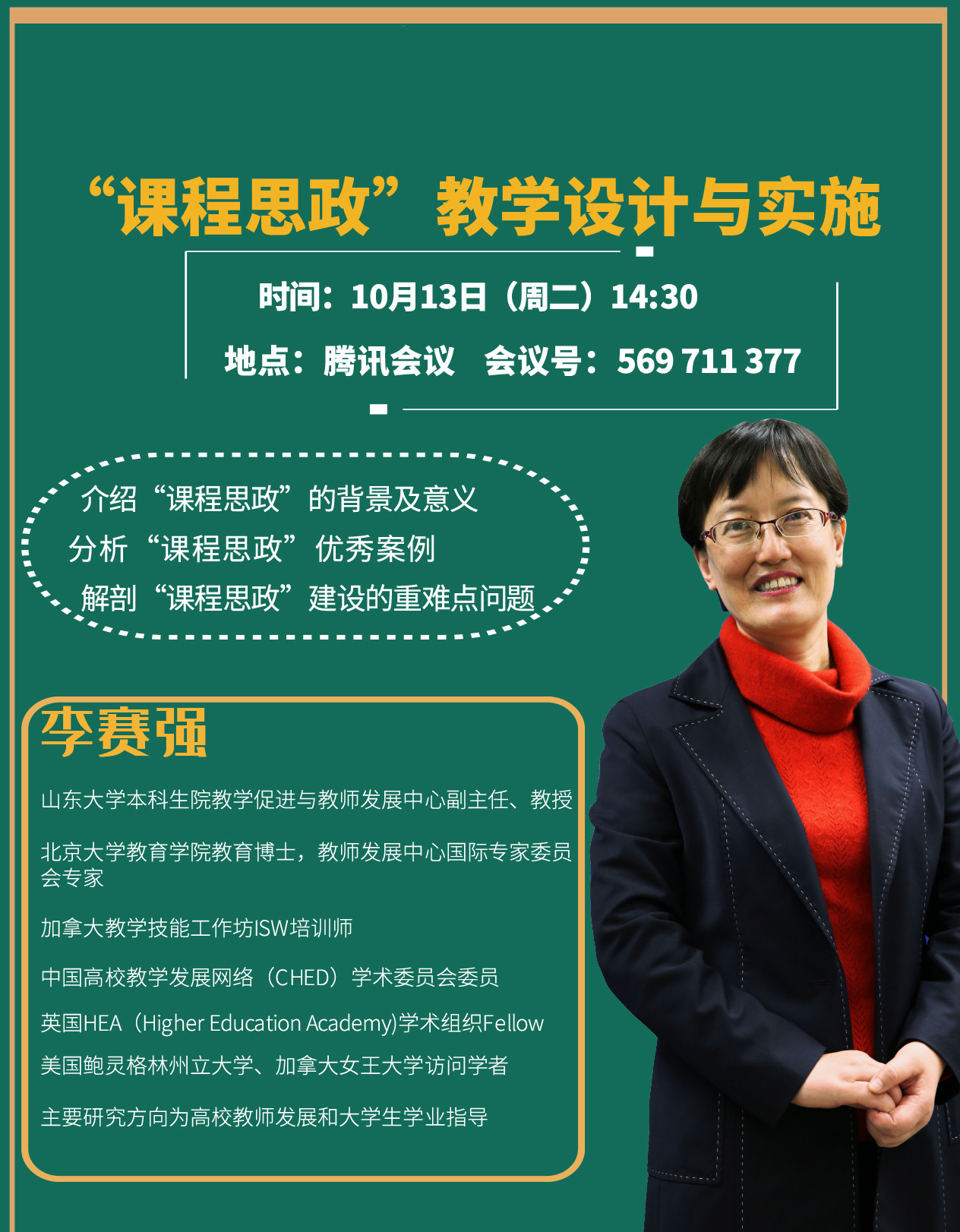 李赛强,山东大学本科生院教学促进与教师发展中心副主任,教授。北京大学教育学院教育博士,北京大学教师教学发展中心国际专家委员会专家。中国高校教学发展网络(CHED)学术委员会委员,加拿大教学技能工作坊ISW培训师,英国HEA(Higher Education Academy)学术组织Fellow。
