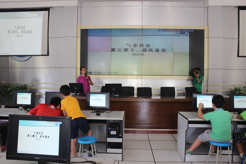 在天气分析与预报实验室里,蔡老师以“观云测天,相风播雨”为主题制作了精美的PPT,向小朋友们简单介绍了大气科学这门严谨而又实用的学科。一幅幅美丽的地球大气层照片,一张张神奇的地球自然风貌,深深吸引了小朋友和家长,其间蔡老师还让小朋友们主动上台分享自己了解的一些自然地理知识,氛围愉快而轻松。