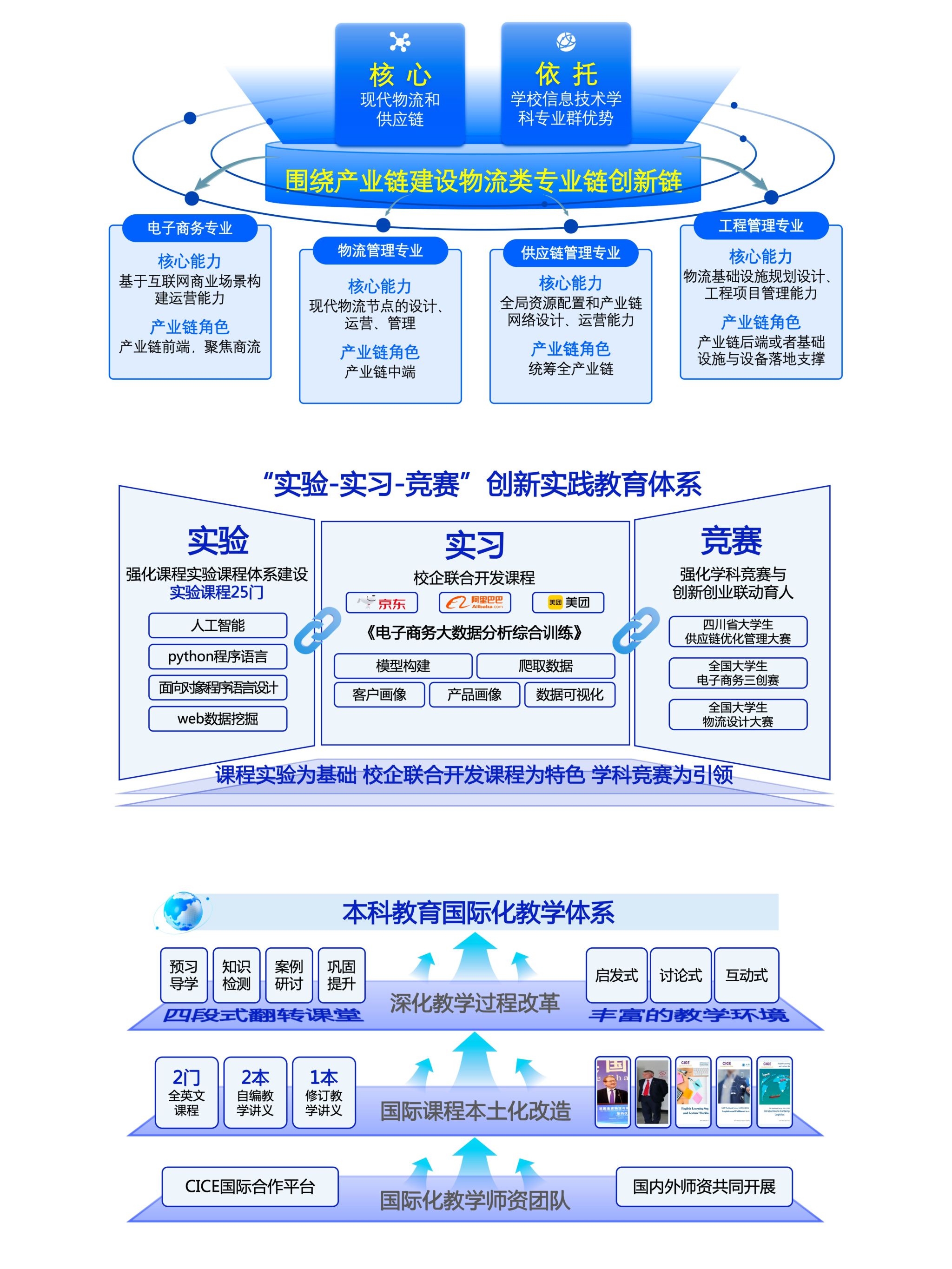 努力提升本科人才培养质量。专业建设方面,学院遵循“覆盖产业链、服务区域发展、强化交叉融合”的专业建设逻辑,精准对应现代物流与供应链产业链的关键环节,实现了对产业链的完整覆盖,并深度融合“文+工”跨学科理念,确保了人才培养与产业需求的动态适配与前瞻布局。电子商务专业和物流管理专业分别获批国家级与省级一流专业建设点,成功申报供应链管理新专业。教研教改方面,支撑7项省级项目,教师获批省级教改项目4项、校级50余项,发表教改论文百余篇。课程建设方面,建成2门全英文课程、3本讲义,30余门一流及混合式课程,校企联合开发4门综合实训课程,7门国家级平台智慧课程。实践育人方面,学生获国家级、省级学科竞赛奖142项,获大创项目立项100余项;承办省级大赛吸引30余所高校、超4000人参赛;50%省奖团队获企业实习或就业邀约,构建了以课程实验为基础、校企联合开发课程为特色、学科竞赛为引领的创新实践教育体系。国际教育方面,成功打造国际化教学团队,所建设全英文课程及教学讲义吸引近2000名学生修读。与英国皇家物流与运输学会(CILT)等机构深度合作,建立CICE国际项目及海外实践基地,构建了贯通“师资-课程-平台”的本科国际化教学体系,有效拓展了师生的国际视野与跨文化学习能力。